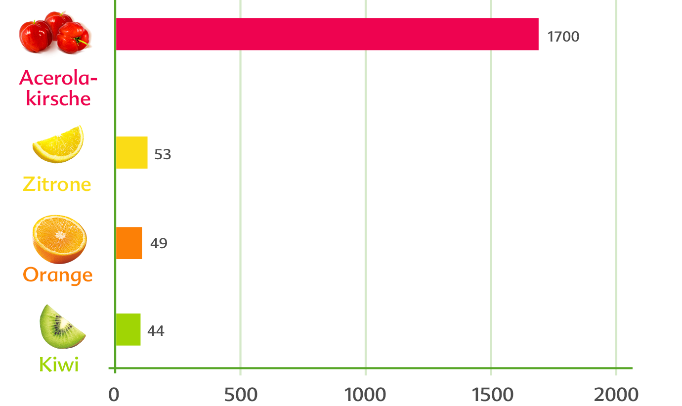 Das Besondere an der Acerolakirsche ist der hohe Vitamin-C-Gehalt. Vitamin C unterstützt die Abwehrkräfte und ist wichtig für die Aufnahme von pflanzlichem Eisen in den Körper. Folgende Tabelle zeigt den Vitamin-C-Gehalt von Acerola im Vergleich zu Zitrone, Orange und Kiwi.