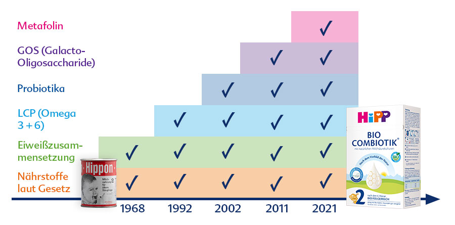 Lernen Sie die wichtigsten Entwicklungsschritte der Milchnahrungen der letzten 60 Jahre kennen und entdecken Sie dabei auch die Besonderheiten der HiPP Milchnahrung.