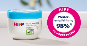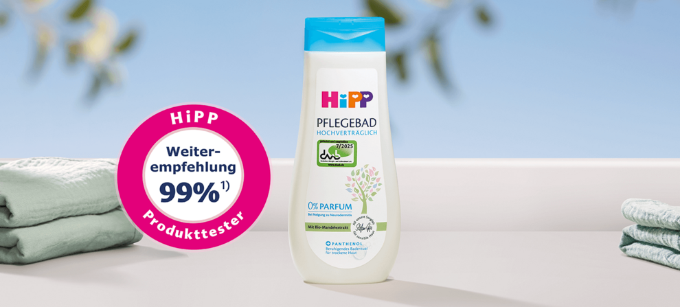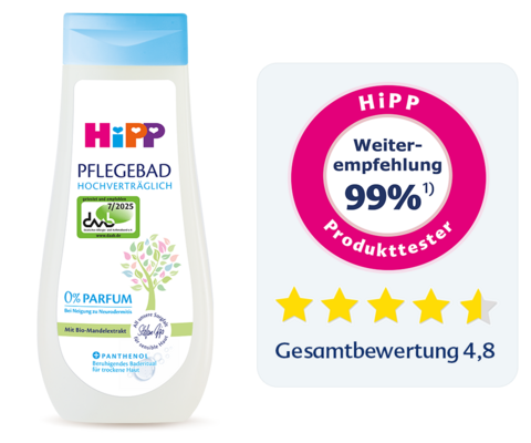 1) 150 Eltern wurden zum HiPP HOCHVERTRÄGLICH Pflegebad befragt. 99% würden dieses weiterempfehlen.