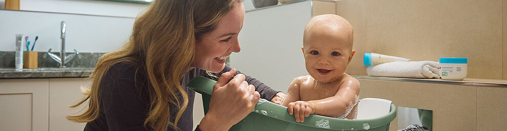 - Um die Haut vor dem Austrocknen zu schützen, sind milde und pflegende Badezusätze wie das HiPP Babysanft Pflegebad oder das HiPP Babysanft Familienbad ideal.
