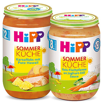 Die neuen HiPP Sommer KÜCHE-Menüs in den außergewöhnlichen Geschmackskombinationen „Reis-Fischpfanne an Joghurt-Dill Sauce“ und „Kartoffeln mit Pute Hawaii“ sind an warmen Tagen leicht bekömmlich und eine erfrischende Abwechslung im Speiseplan. Mit gut verdaulichen Zutaten wie Gemüse, Reis, Seelachs oder Putenfleisch eignen sich die Sommer KÜCHE-Menüs als vollwertige Mahlzeit für Babys ab dem 8. bzw. 12. Monat. Beide Sorten sind in gewohnter HiPP Bio Qualität hergestellt und kommen ohne Aromen, Konservierungsstoffe, Farbstoffe und Verdickungsmittel aus.